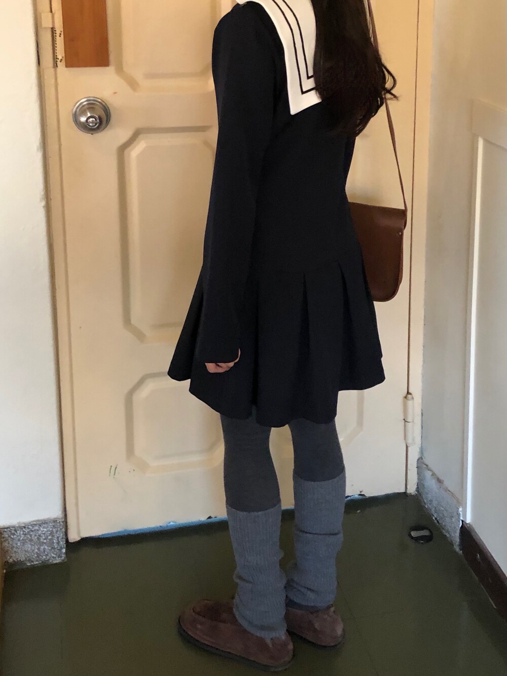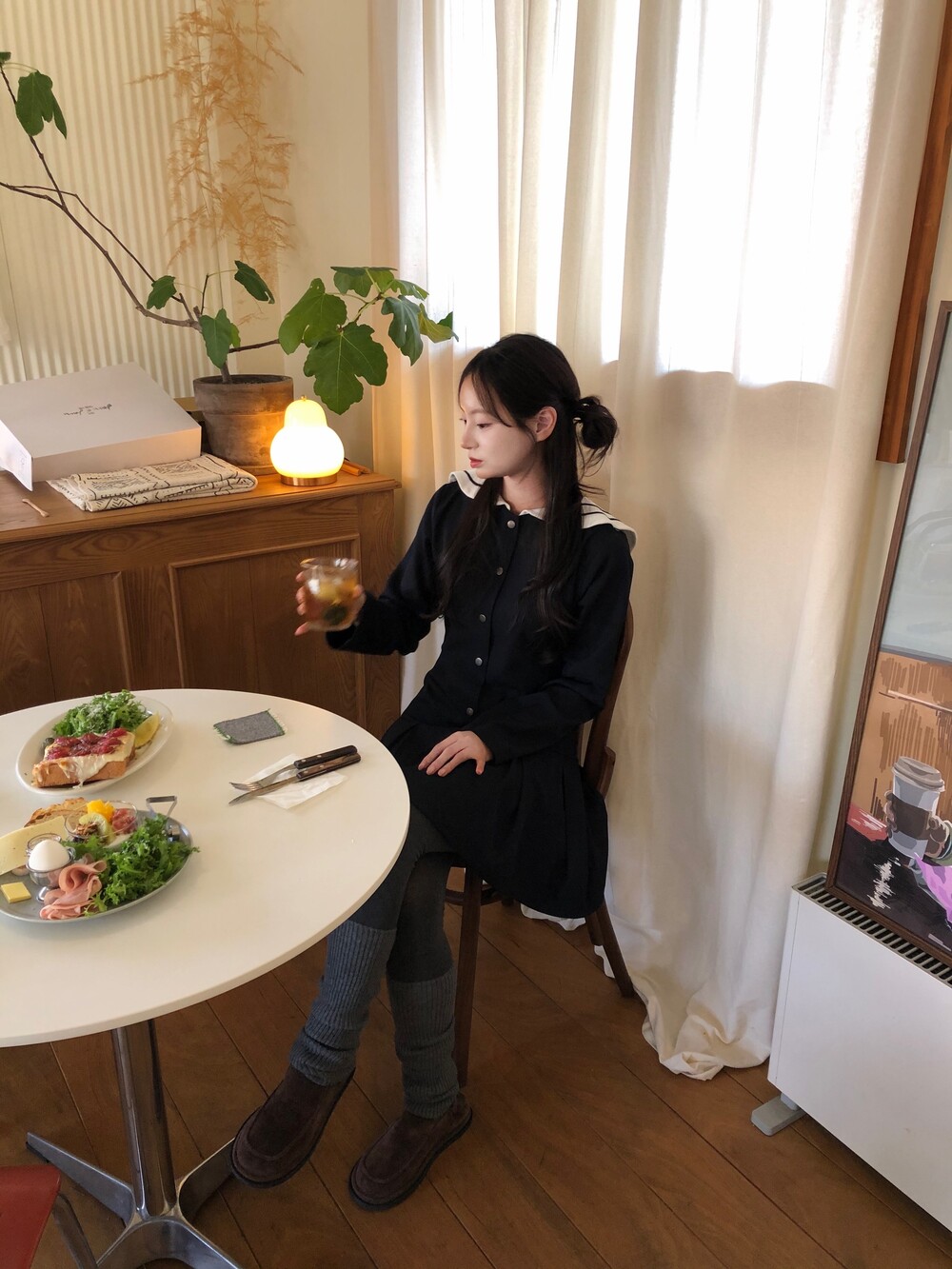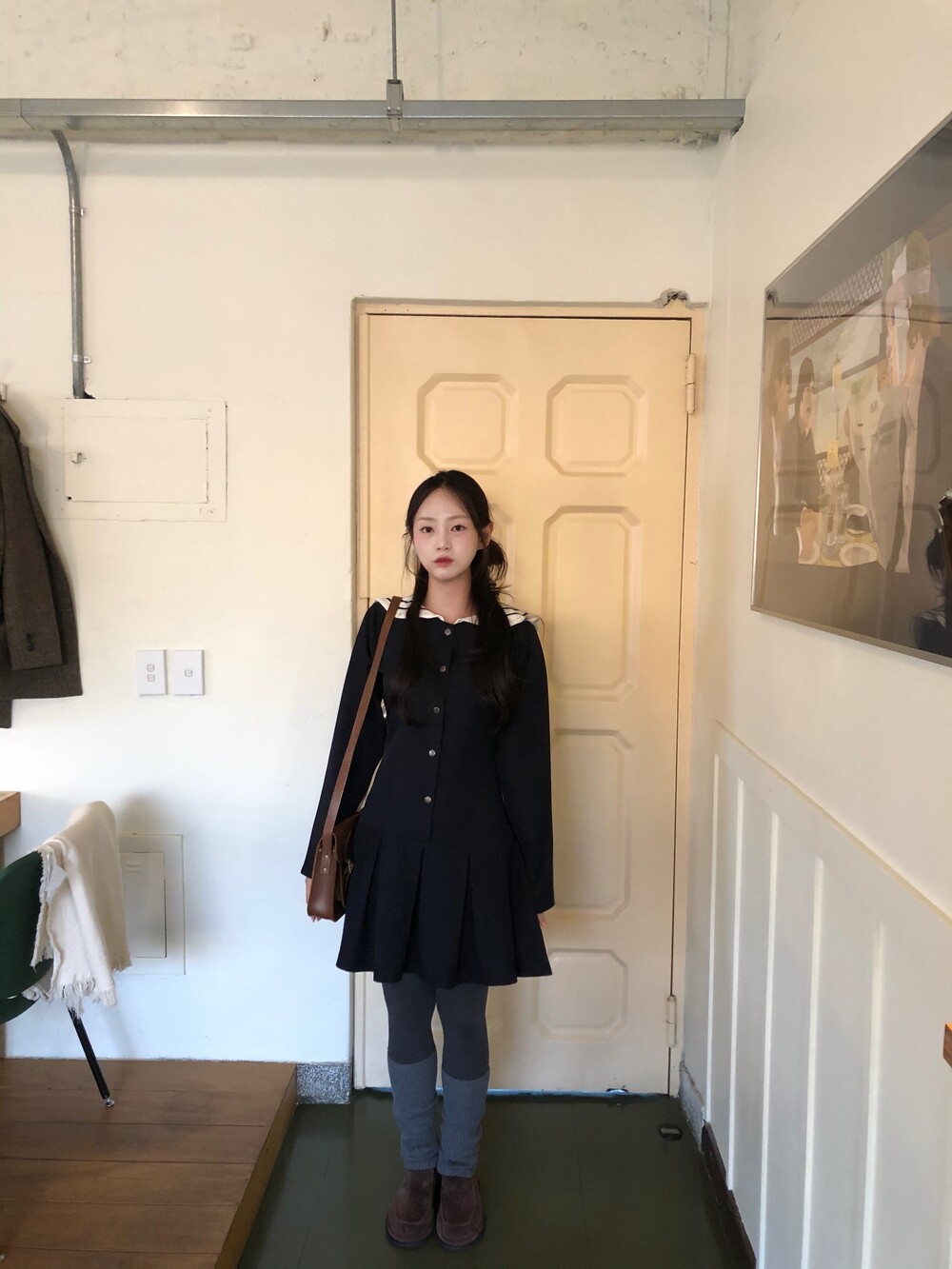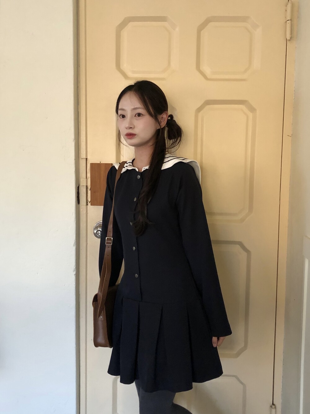 디토 원피스는 딥한 네이비 컬러로 차분함을 주었고 , 허리선을 로우웨이스트로 내려 발랄한 느낌을 살짝 조절했어요 .