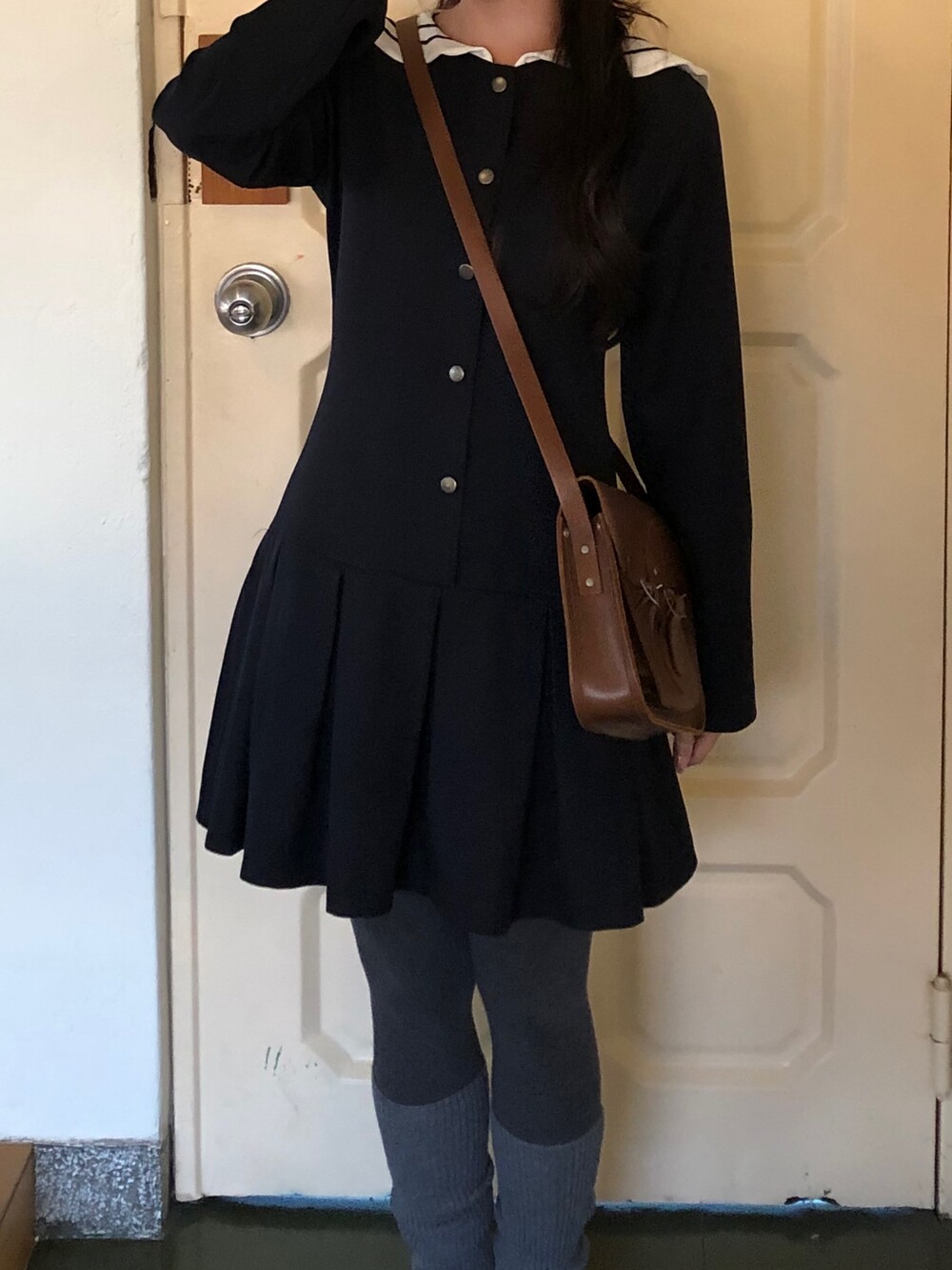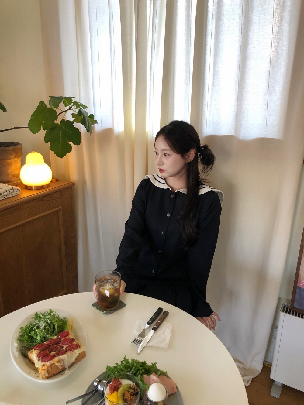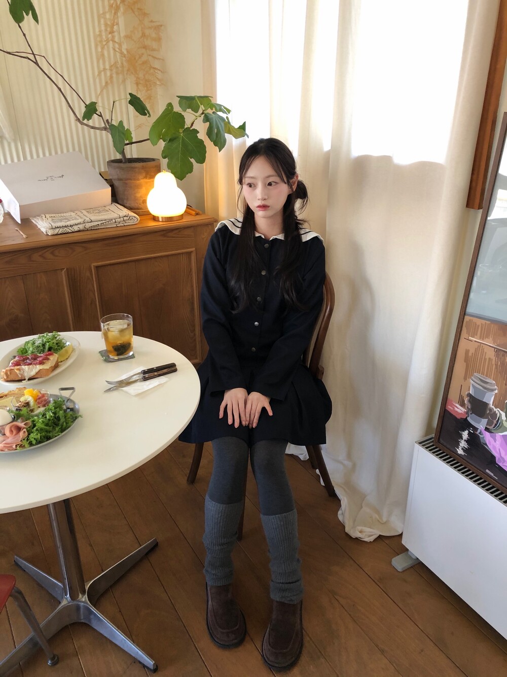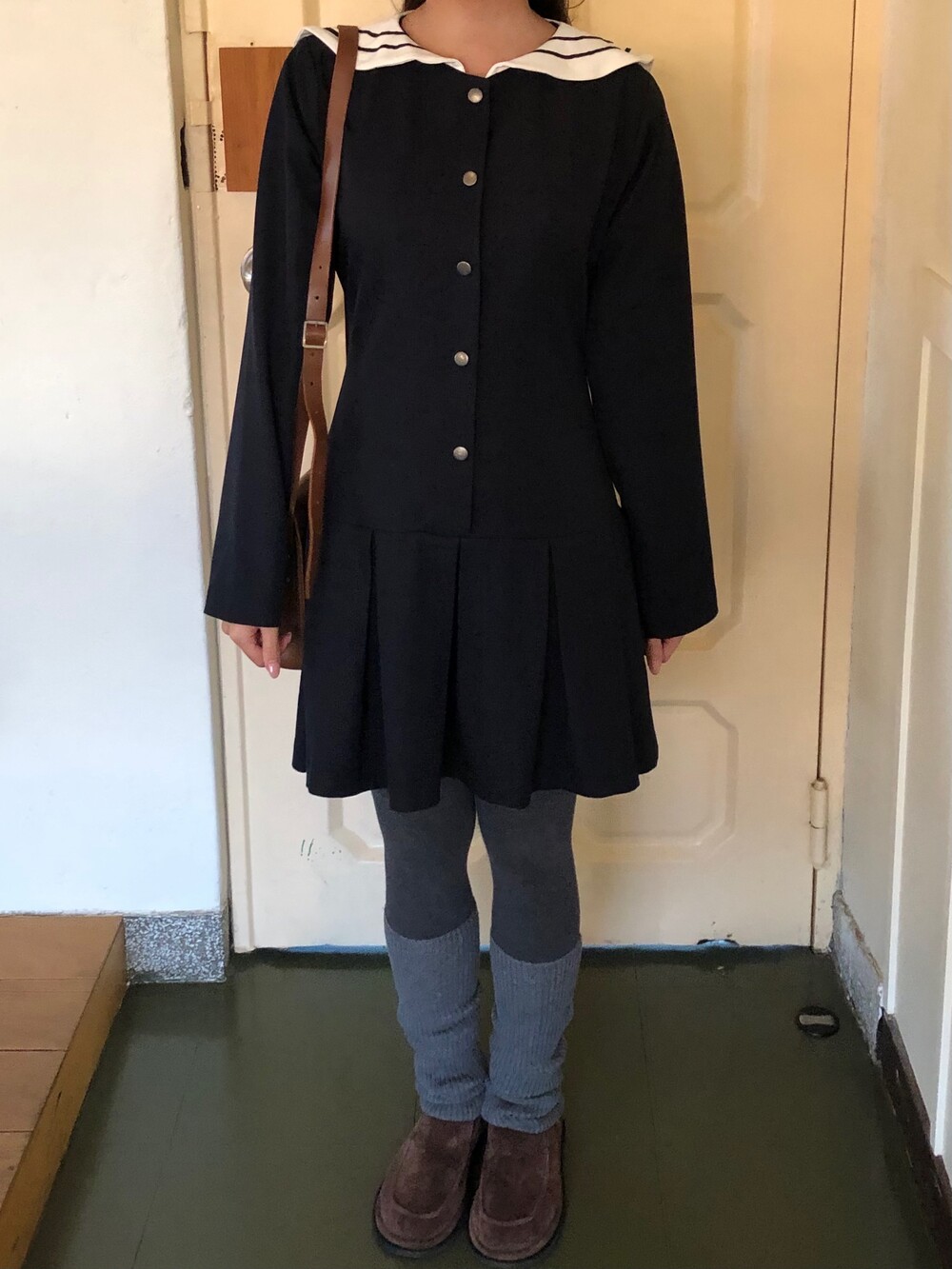 디토 원피스는 딥한 네이비 컬러로 차분함을 주었고 , 허리선을 로우웨이스트로 내려 발랄한 느낌을 살짝 조절했어요 .