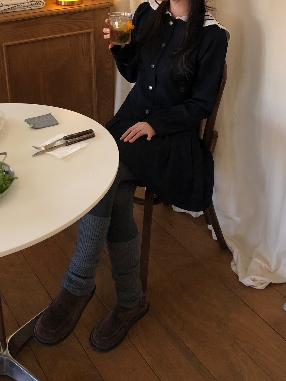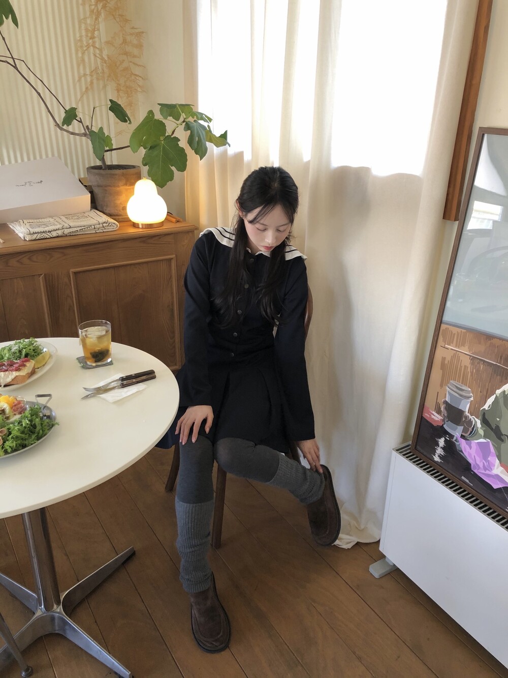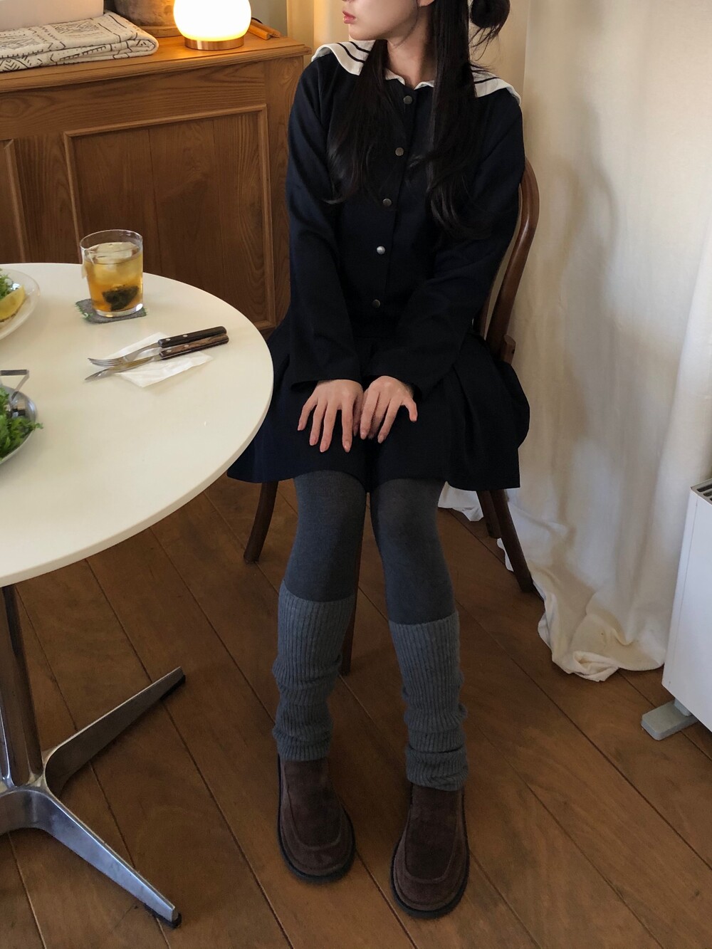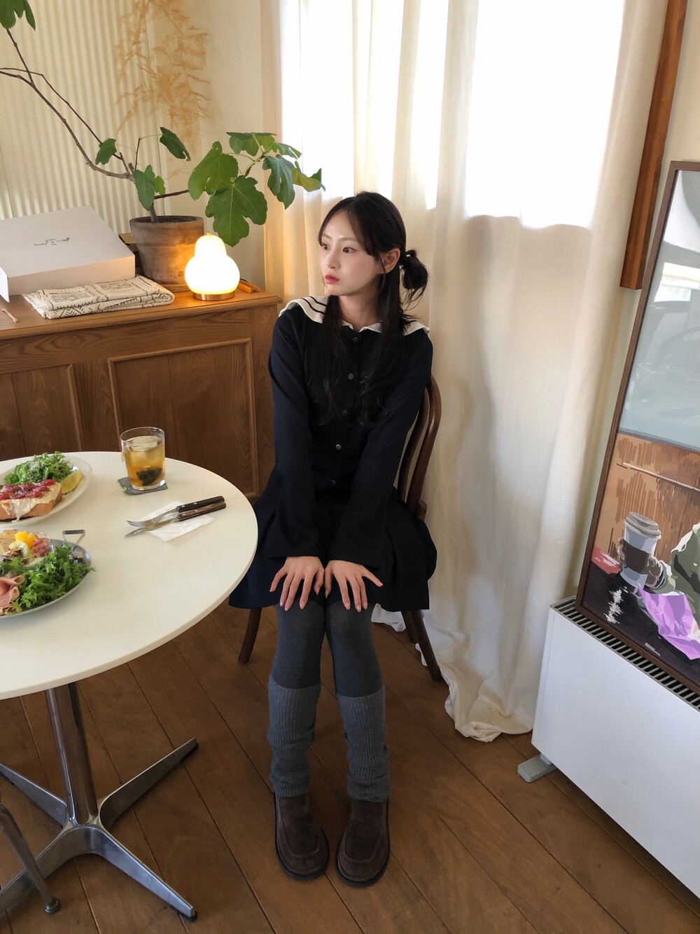 디토 원피스는 딥한 네이비 컬러로 차분함을 주었고 , 허리선을 로우웨이스트로 내려 발랄한 느낌을 살짝 조절했어요 .