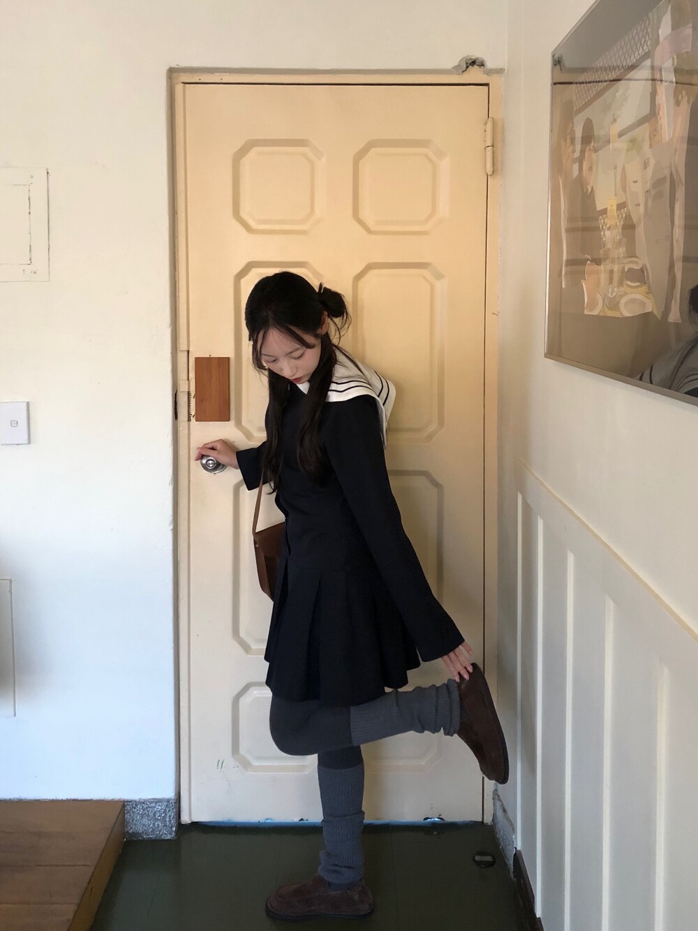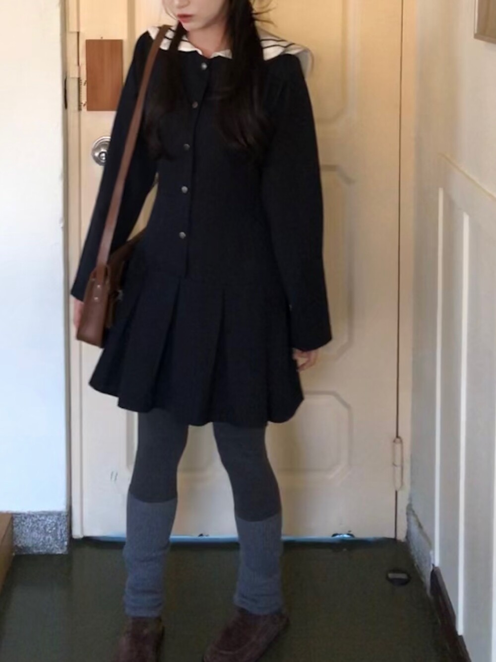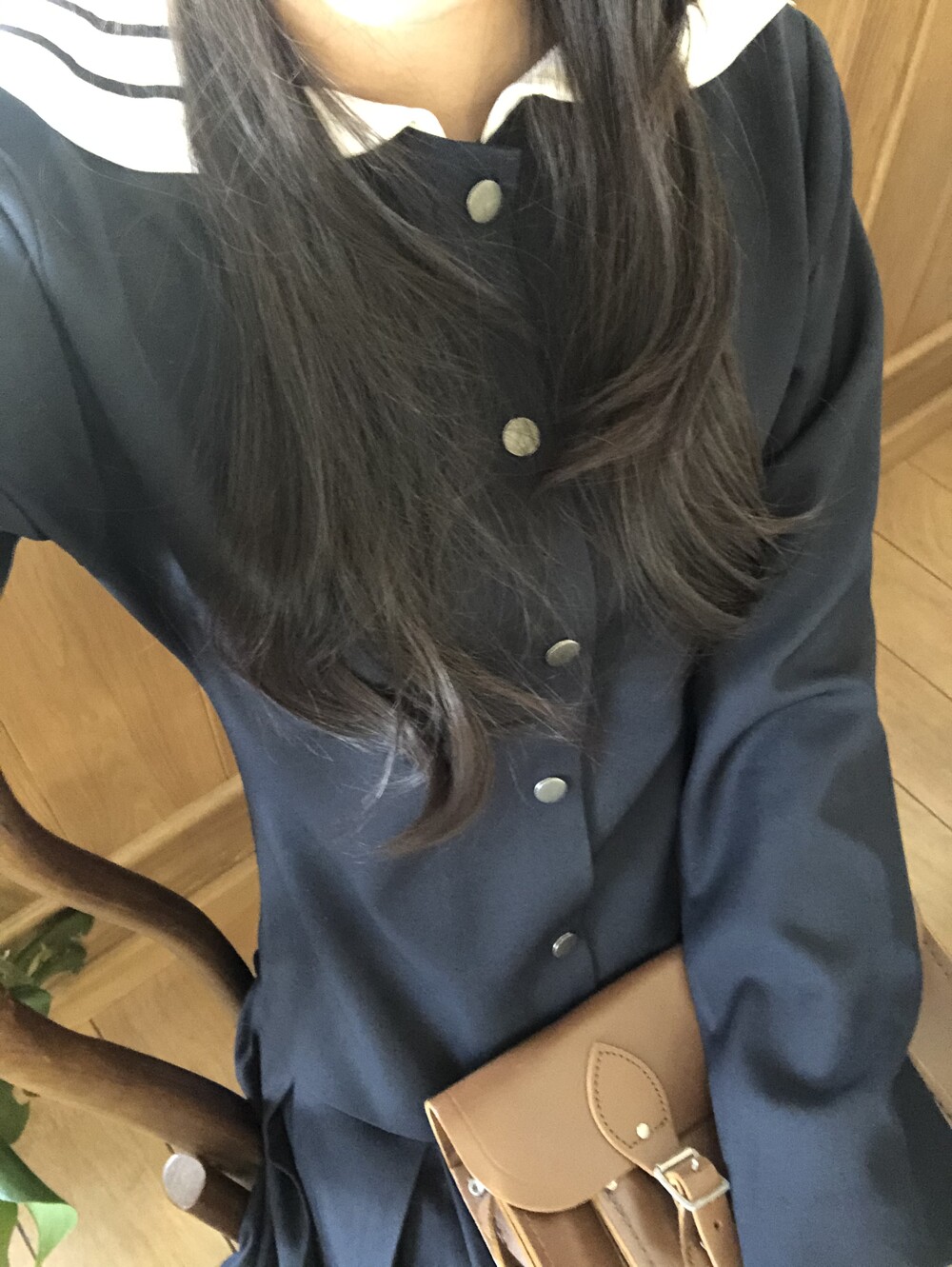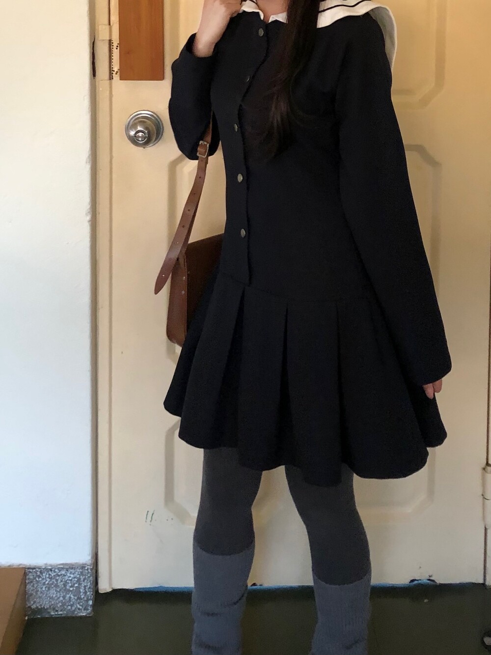 디토 원피스는 딥한 네이비 컬러로 차분함을 주었고 , 허리선을 로우웨이스트로 내려 발랄한 느낌을 살짝 조절했어요 .
