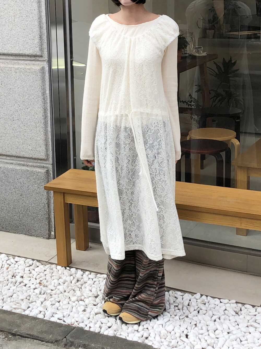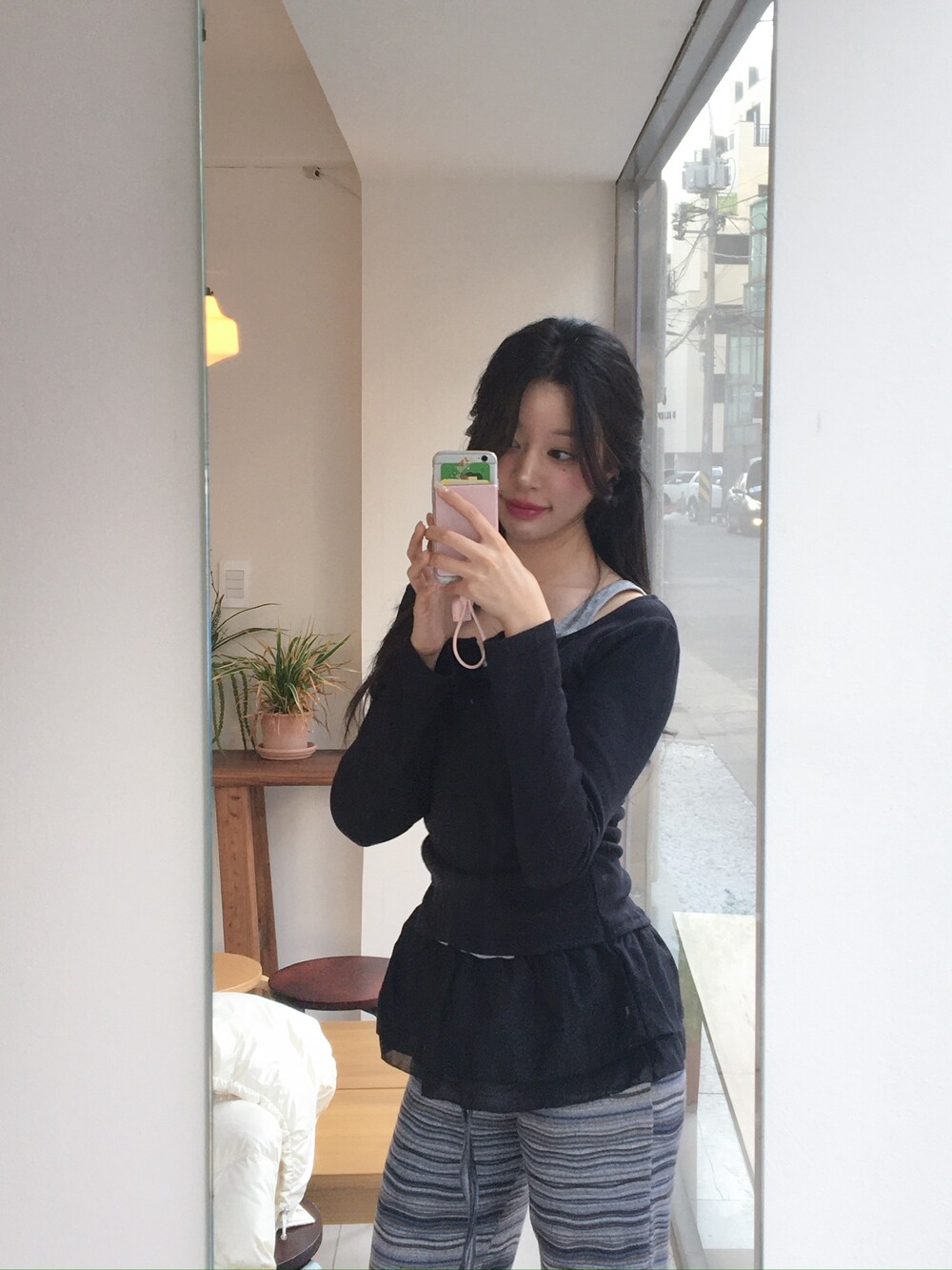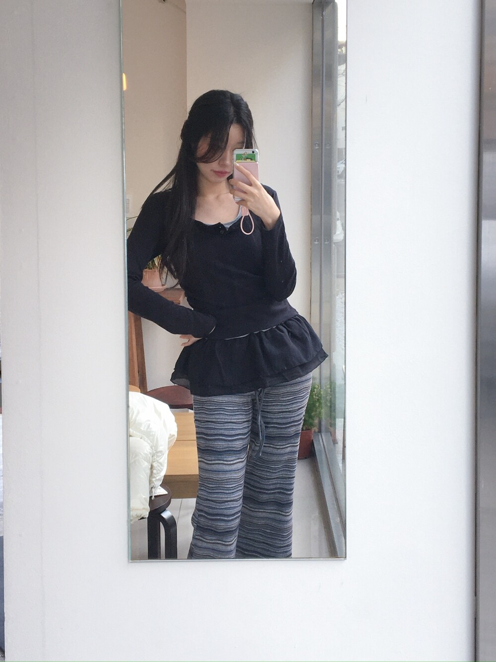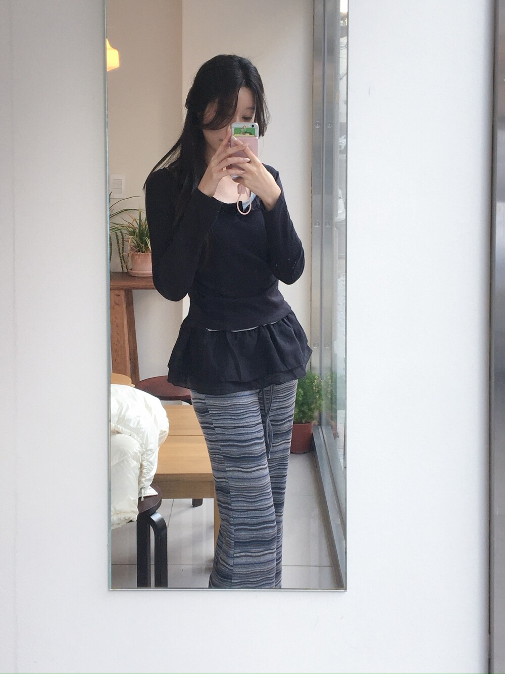 허벅지도 너무 붙지 않아 슬림해보이고 , 두께감도 적당해서 스커트와 레이어드해도 예쁘답니다 .