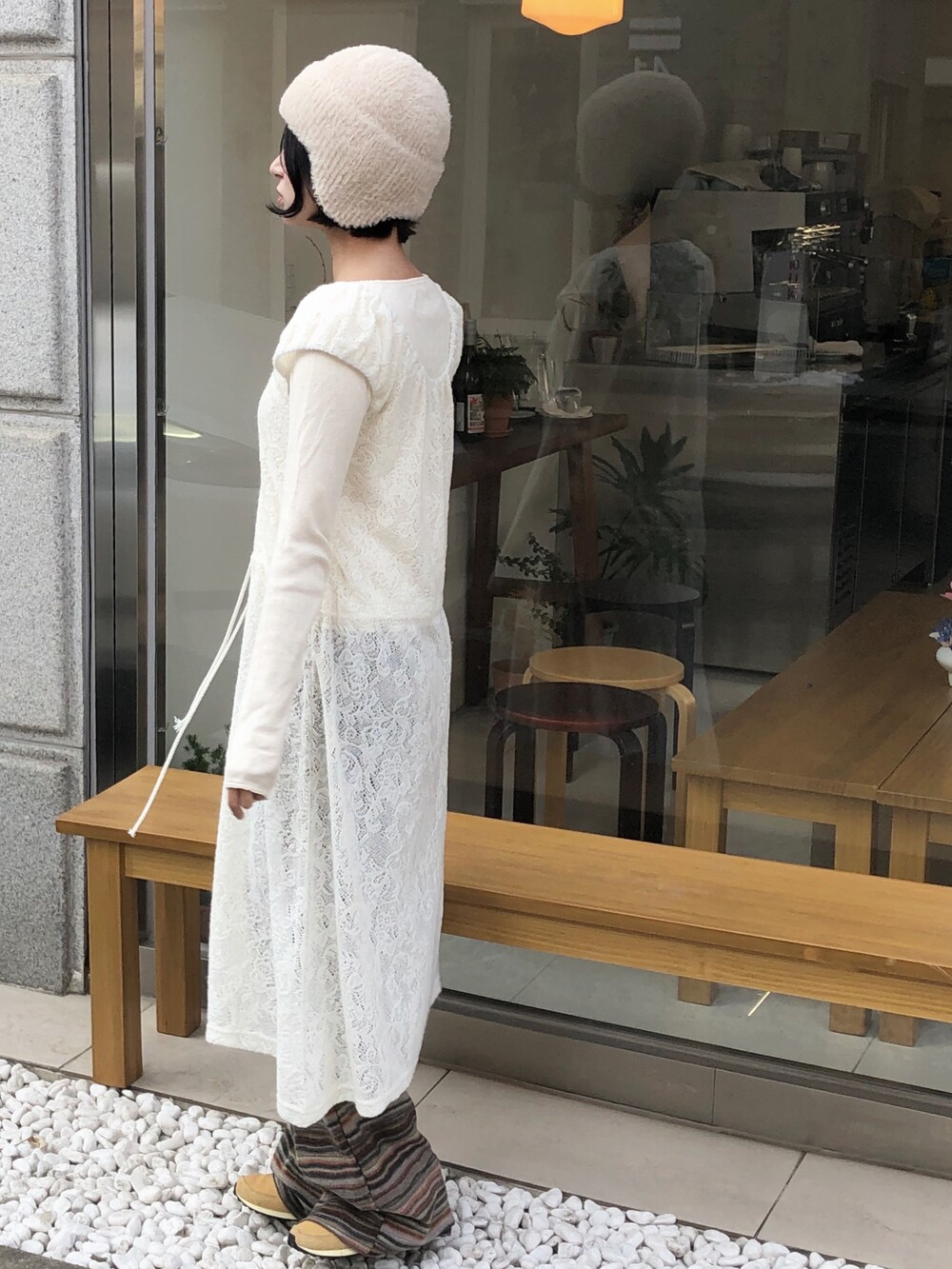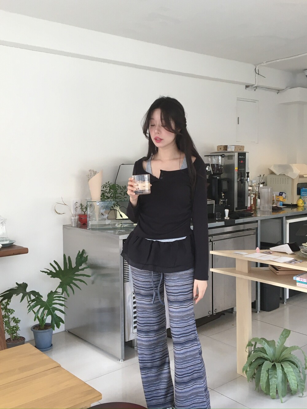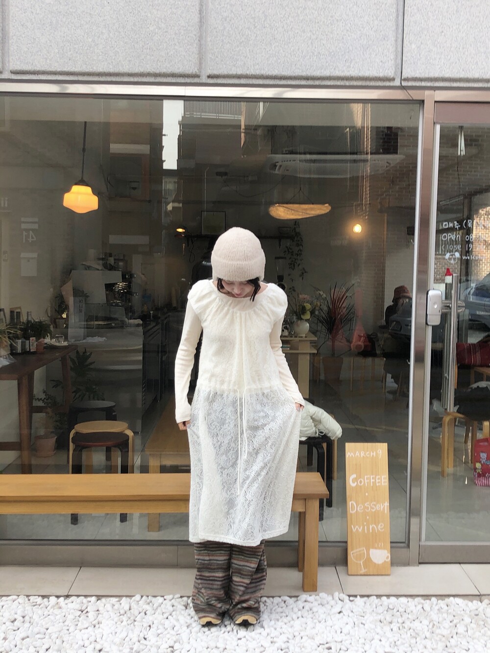 허벅지도 너무 붙지 않아 슬림해보이고 , 두께감도 적당해서 스커트와 레이어드해도 예쁘답니다 .