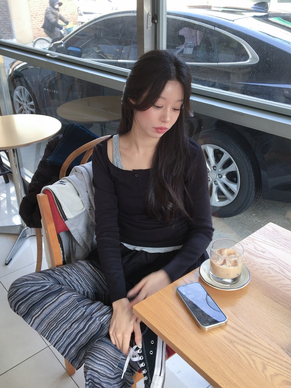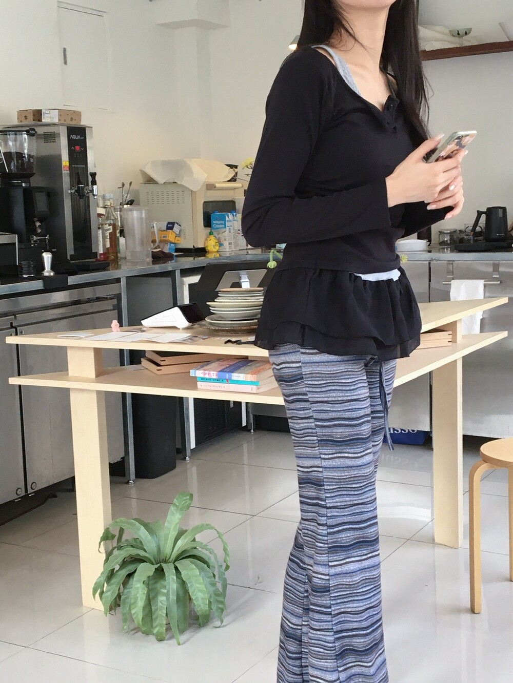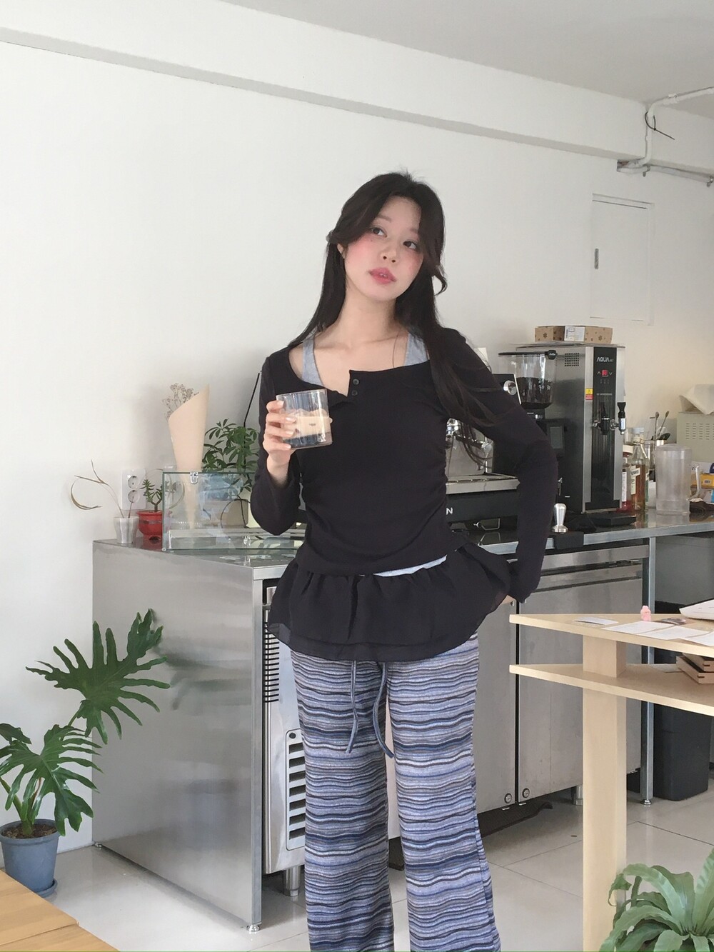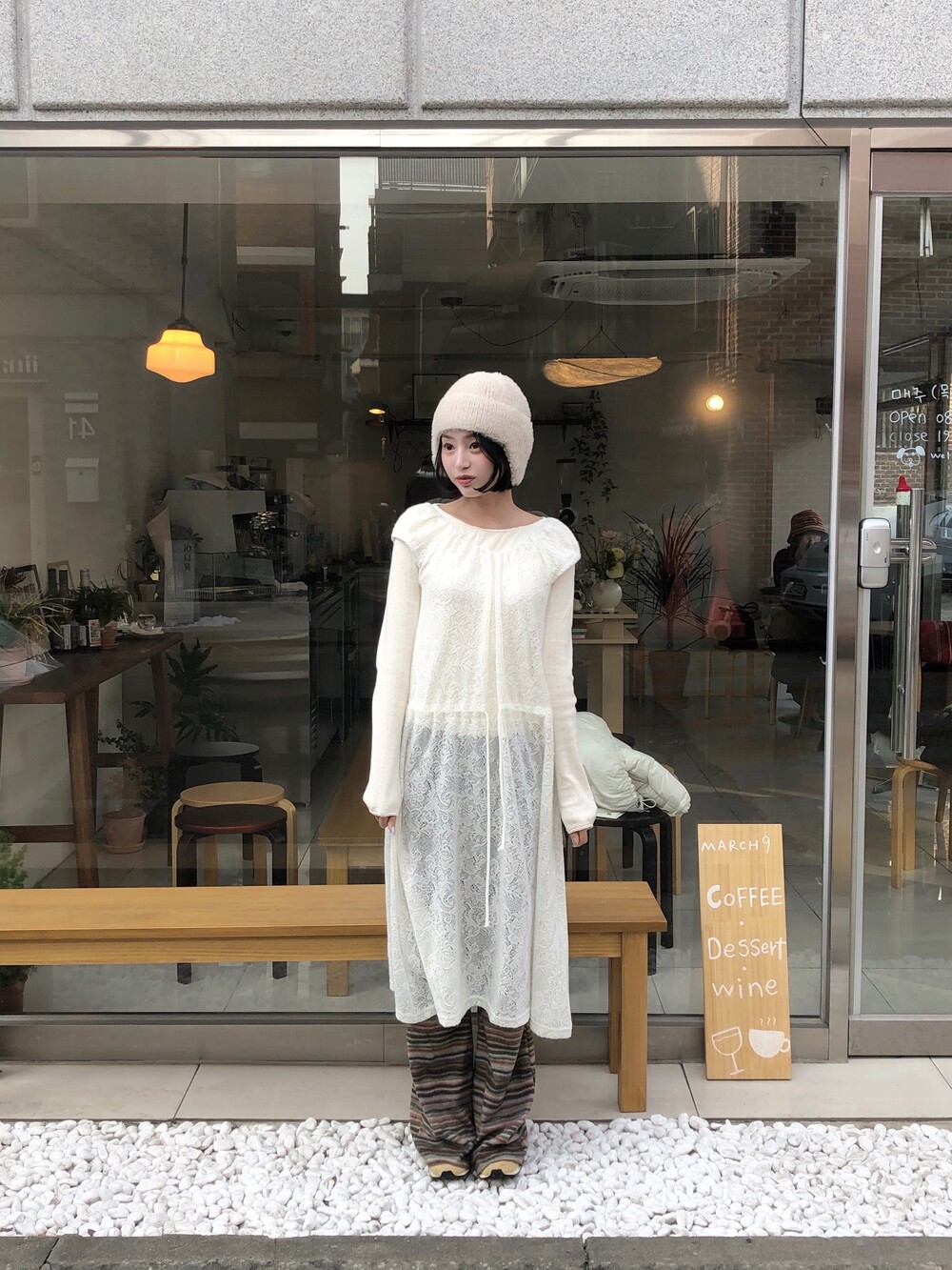 허벅지도 너무 붙지 않아 슬림해보이고 , 두께감도 적당해서 스커트와 레이어드해도 예쁘답니다 .