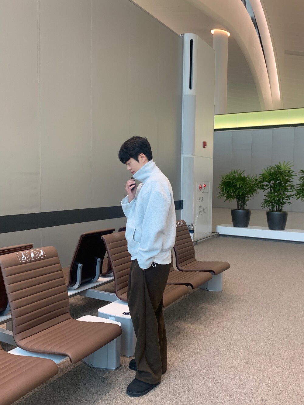 저보다 오히려 남편이 더 만족스러워 하더라구요 ! 남자분께는 살짝 반크롭 기장으로 떨어져서 다리가 길어보여요 .