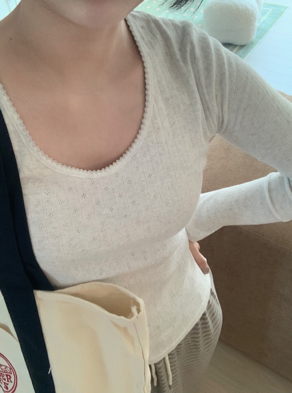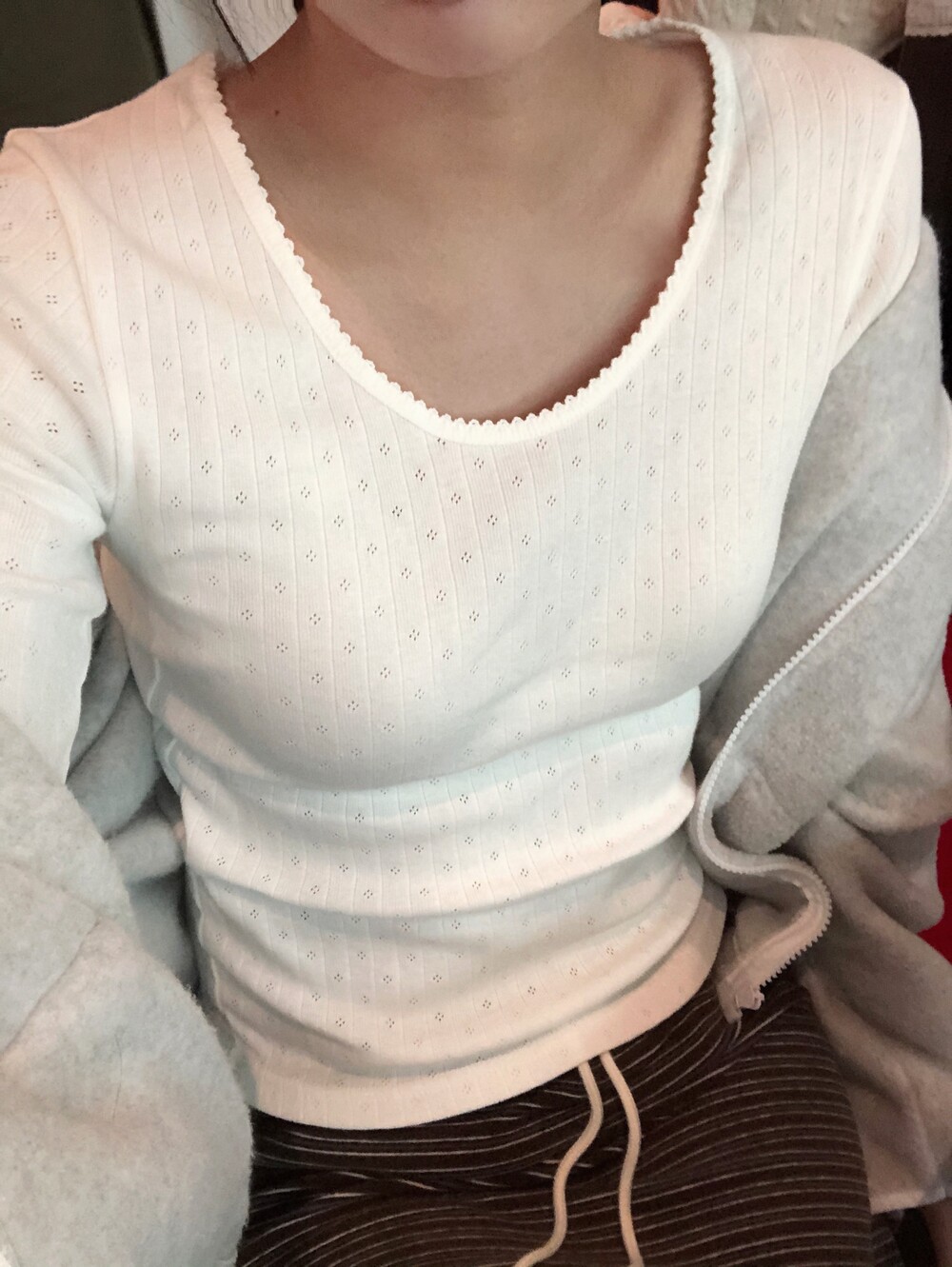 넥라인에 부담스럽지 않은 레이스가 들어가있고 , 신기하게도 원단이 얇은데 속옷 라인이 비치지 않아요 .
