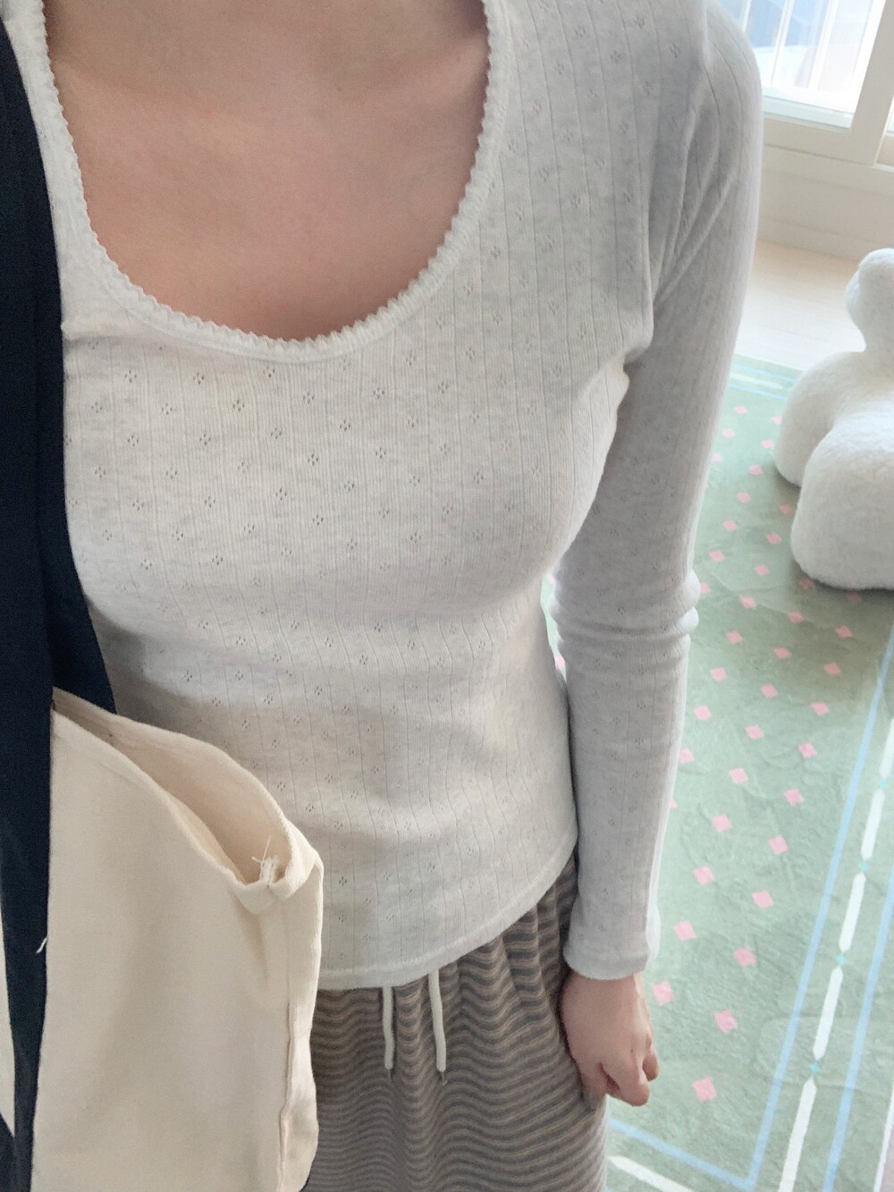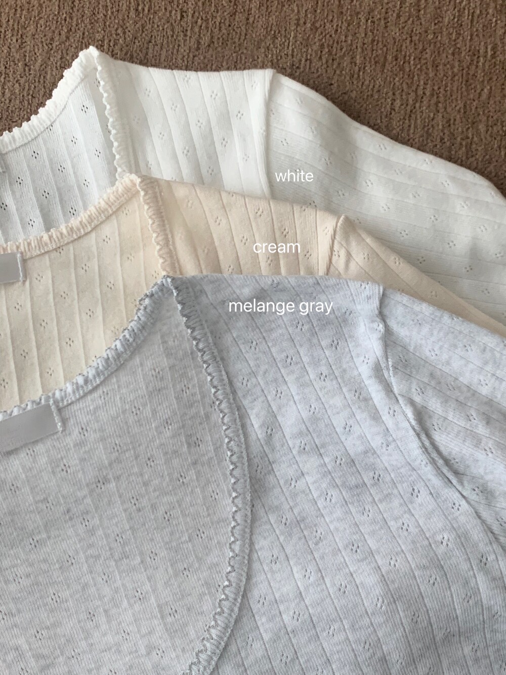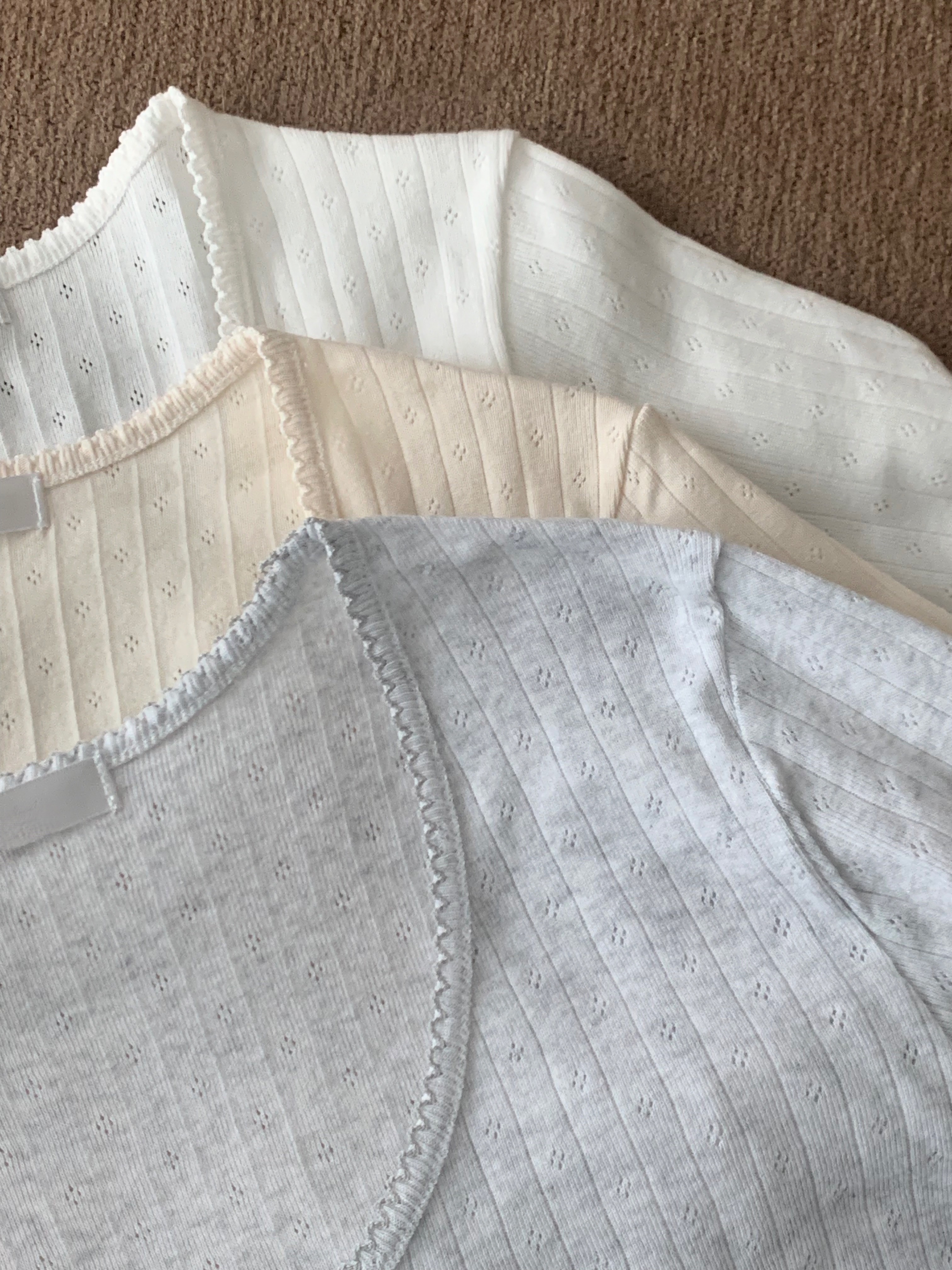 얇고 몸에 챡 감겨서 가디건이나 후드집업 등 여러 아우터 안에 매치하시기 좋을거예요 .