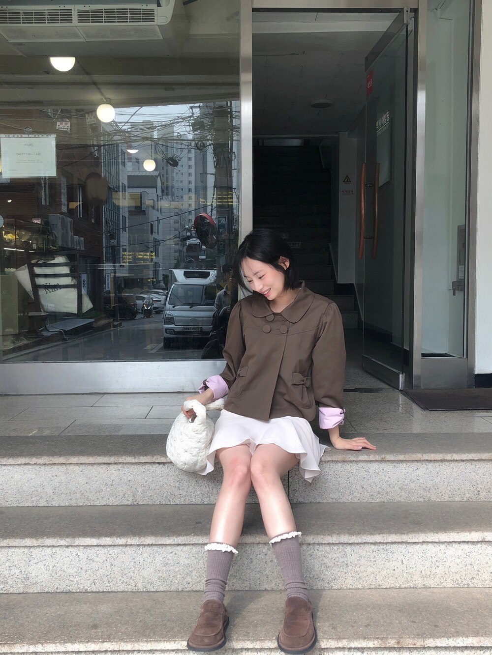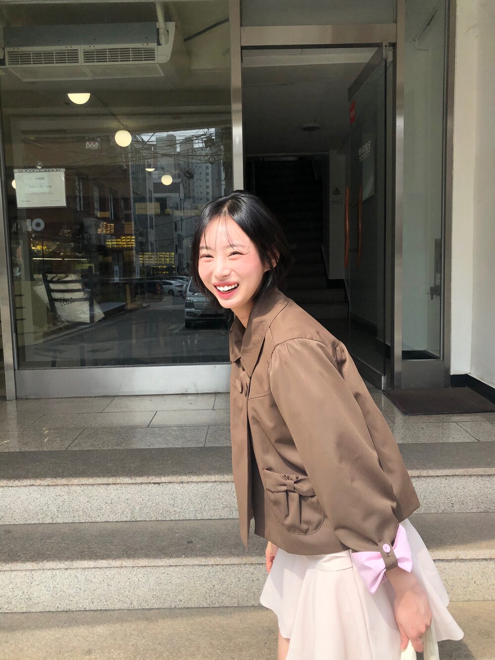 플리츠 주름을 잡았는데 자켓이 살짝 아방한 핏이라 스커트까지 풍성했을 때 과할 것으로 염려되어