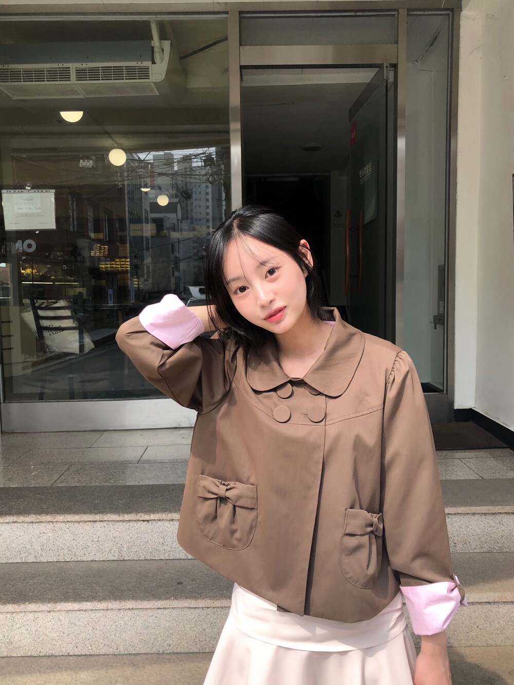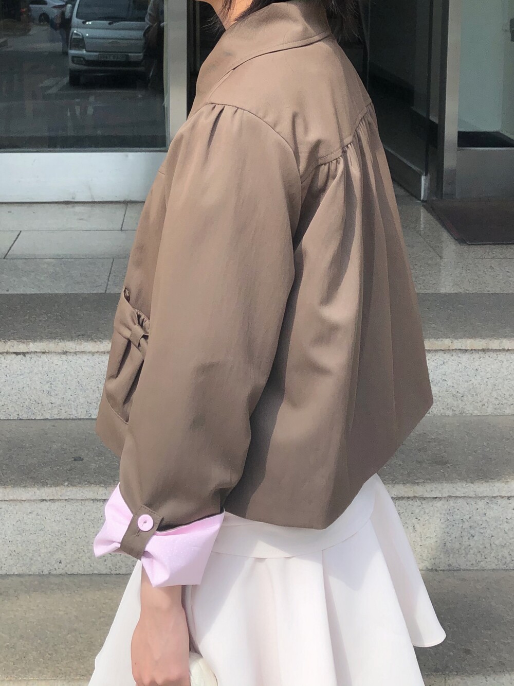 소매를 롤업해서 입었을 때는 조금 더 귀여운 느낌 . 롤업 단추를 딱 채웠을때 소매 모양이 리본같은 느낌이 들어요 .