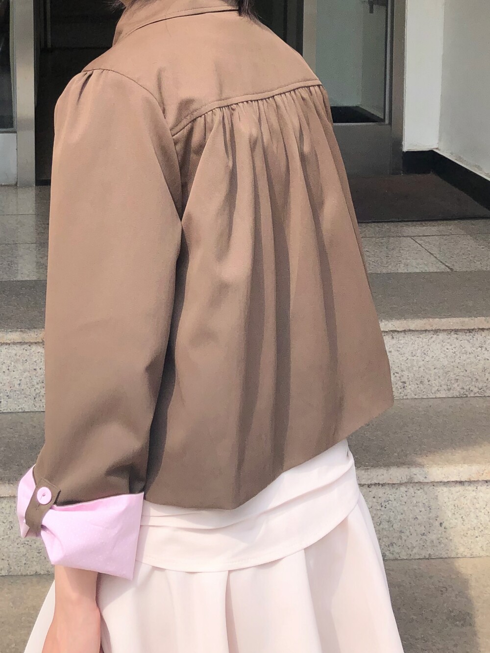 등판 쪽에는 셔링을 잡아 자켓입에도 활동성에 부담이 없고 편안한 착용감을 느끼실 수 있을거예요 .