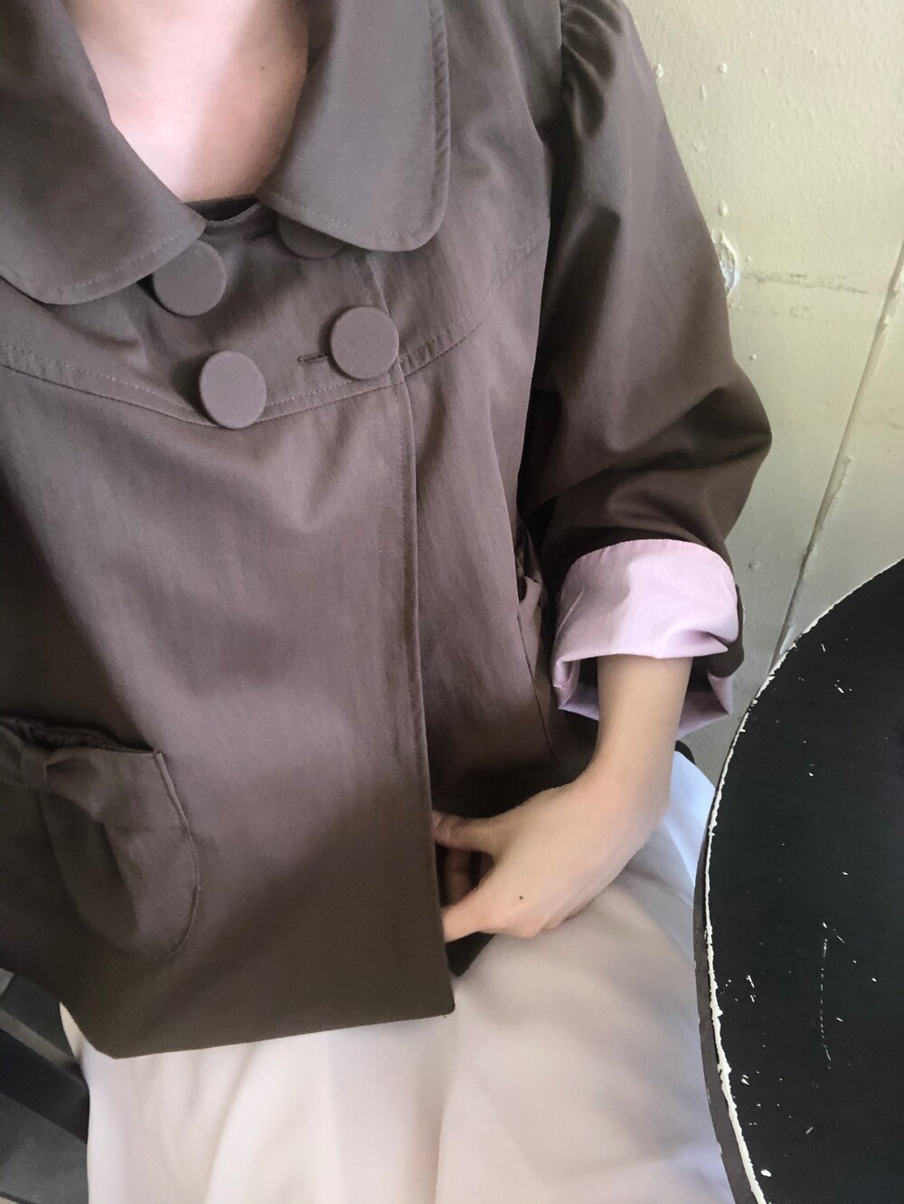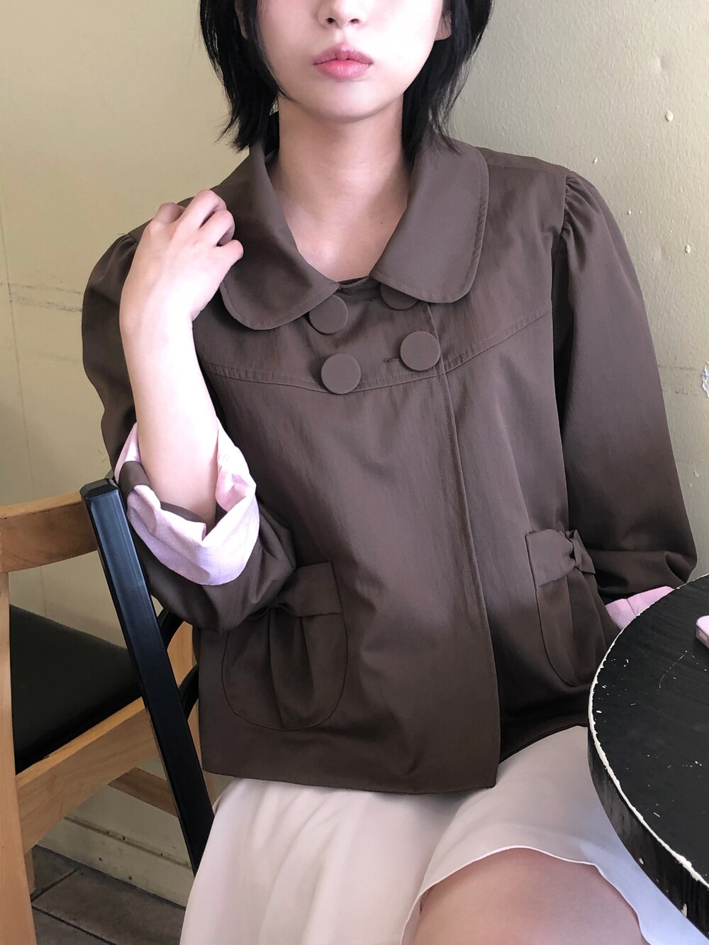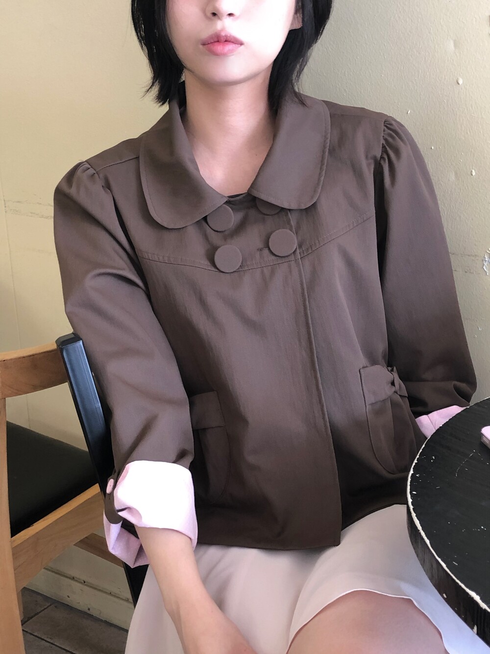 넥라인을 살짝 파서 너무 답답하지 않게 했어요 . 둥근 카라와 빅사이즈 싸개단추가 얼굴을 작아보이게 만들어주고요 .